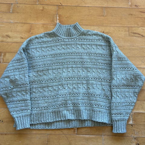 Blød, tynd bluse i strik med 3/4-ærmer Formentlig ren bomuld. Har nogle få skader som den på sidste billede (ikke tydeligt). Mærke er klippet af, men den passer fra M-XL afhængigt af fit (jeg bruger str. 44)