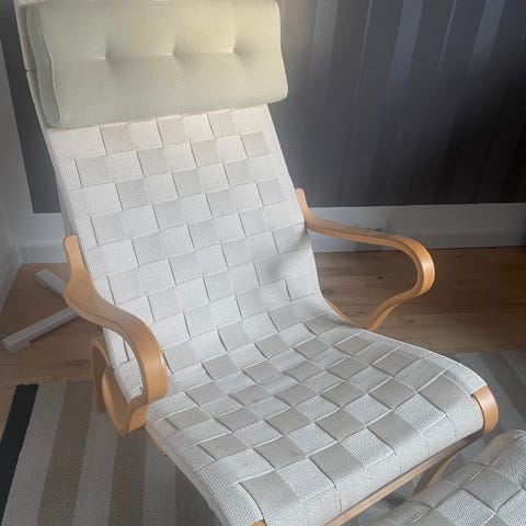 Klassisk skandinavisk design med formspændt bøgetræ, original flettet webbing og original nakkepude. En ikonisk designstol med fantastisk siddekomfort og et tidløst udtryk.