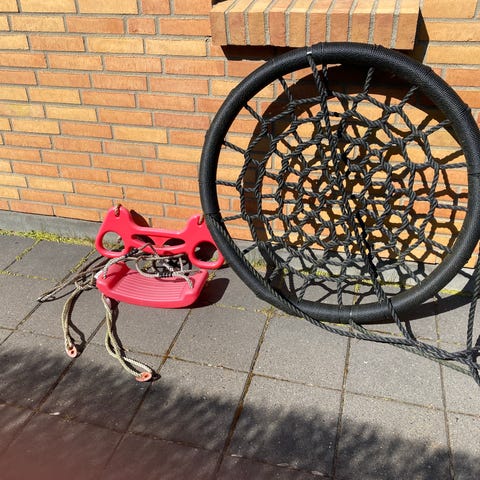 redegynge til børn med rundt sæde og net i midten. Gynge i sort reb og polstret ringkant. Velegnet til ophæng i stativ eller loft/krog efter korrekt montering. Beregnet som legetøj og afslapning for børn under opsyn af voksne. Størrelse er 1 meter i diameter.