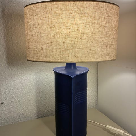 Dekorativ lampe med et flot retro-inspireret design. Den gule fod kombineret med blå og grå detaljer giver et unikt og farverigt udtryk, der passer perfekt ind i både stuen eller sommerhuset.