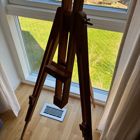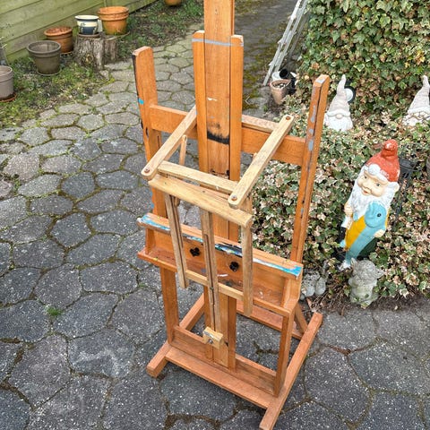 Staffeli i træ med justerbar højde. Klassisk trebenet konstruktion, egnet til opspænding af lærreder eller plader. Velegnet til brug i atelier, hobbyrum eller til præsentationer.