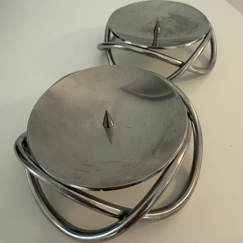 Georg Jensen lysestager i metal. Sæt med to stager i blankt metal med rund fod og integreret pig til bloklys eller kuglelys. Organisk, buet stel omkring foden.