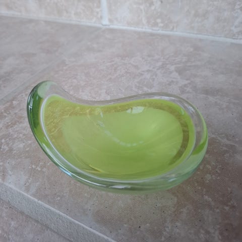 Virkelig smuk lille sag i en fantastisk grøn farve. Tung kvalitet med et flot lysindfald. 12 cm i diameter, 6 cm høj. Fejlfri stand.