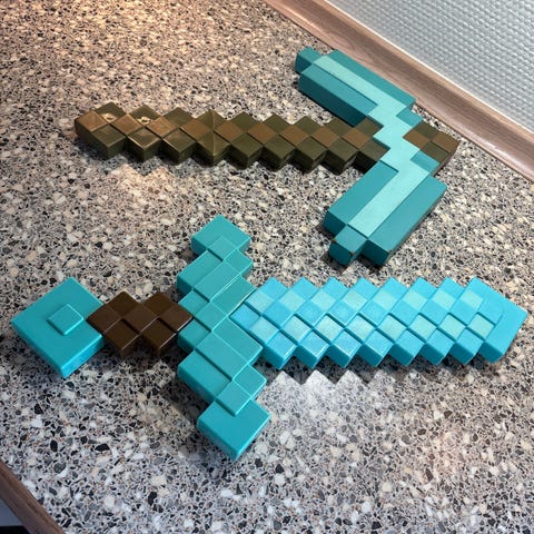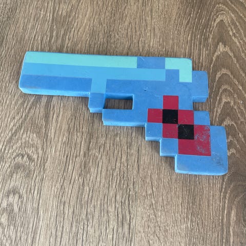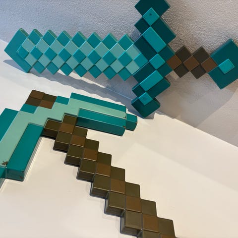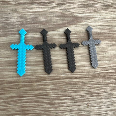 Minecraft legetøjssæt med sværd og hakke i plastik. Begge dele er udformet i klassisk Minecraft-pixelstil med blå og sorte felter. Egnet som rollelegstilbehør for børn, der kan lide Minecraft-universet. Sættet består af to dele: ét sværd og én hakke i matchende design.