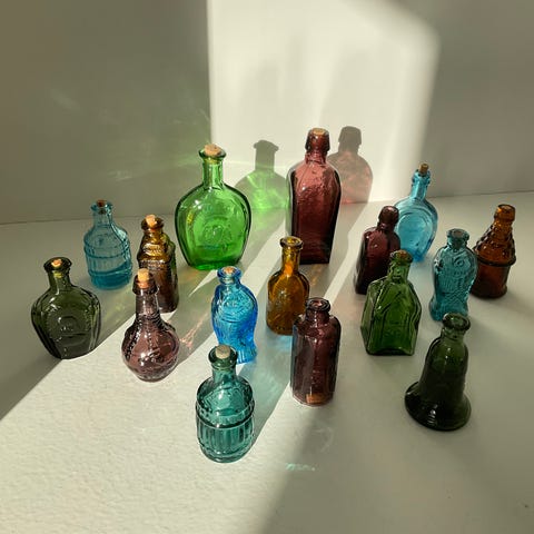 Samling af gamle glasflasker i blandede størrelser og former. Flaskerne er hovedsageligt i grønne og brune nuancer.