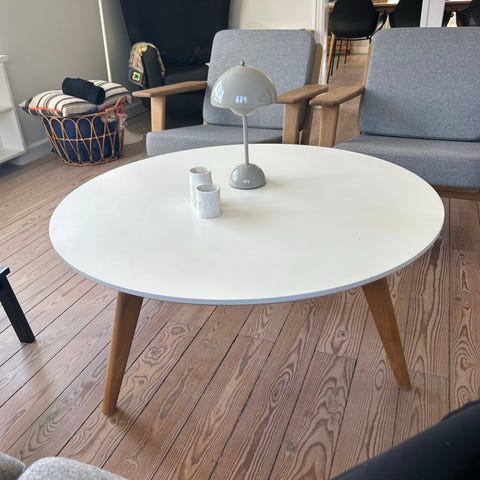 Fint og stilrent sofabord i hvid med ben i natur eg sælges. Bordet måler 60 x 120 cm og passer perfekt til stuen.