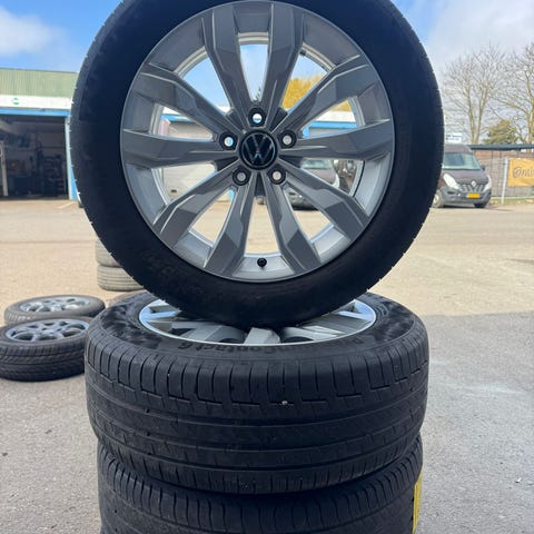 Flotte VW 17” alufælge med næsten nye kvalitets Continental sommerdæk. Dækkene har kun kørt én sæson.