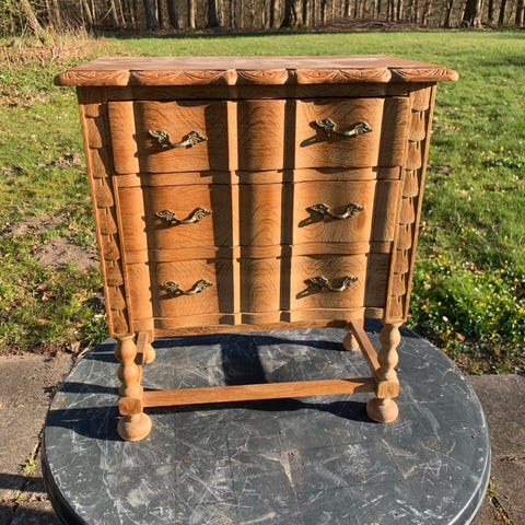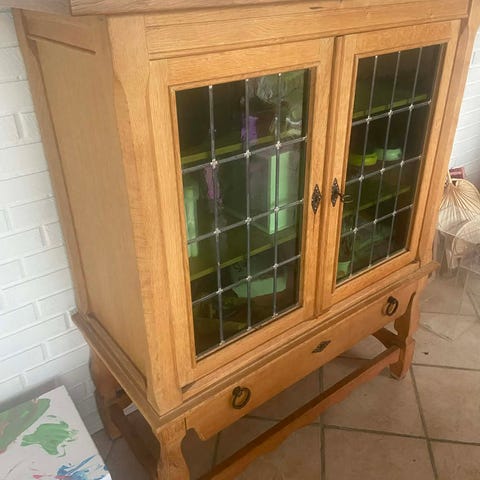Egetræsskænk. Skænken er udført i lyst træ med synlig årestruktur og står på drejede ben. Foran er der to skuffer med greb samt åbne rum med lodrette skillerum, der kan bruges til opbevaring af eksempelvis plader, magasiner eller mapper. En af hylderne kan klappes ud som ekstra afsætningsplads. Møblet er velegnet som opbevaringsmøbel i stue, kontor eller gang
