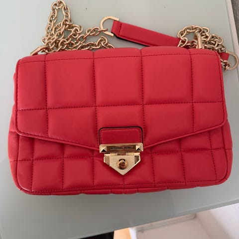Michael Kors skuldertaske i læder til kvinde. Tasken er udført i sort, quiltet læder med guldfarvet kæderem og metal-lås på fronten. Indvendigt har tasken flere rum, herunder lynlåsrum og åbne lommer til organisering af mindre genstande som kort, nøgler og telefon. Logoet er præget indvendigt i tasken. Velegnet som mindre skuldertaske eller clutch til hverdag og brug ved særlige lejligheder.