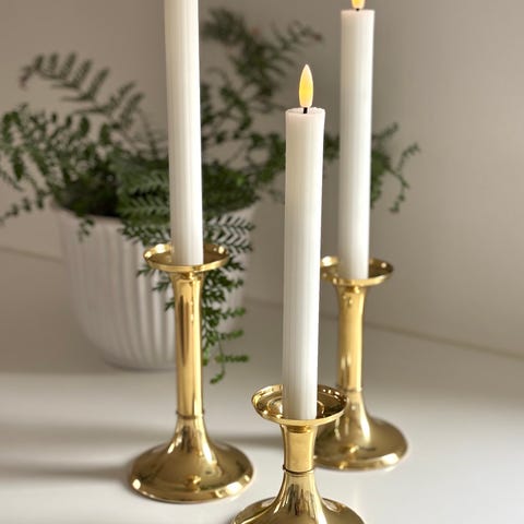 Sæt med to lysestager i messing med firkantet sokkel. Klassisk, søjleformet design med lyseskål øverst til almindelige kronelys. Egnet til brug på bord, reol eller vindueskarm som belysning eller dekoration i hjemmet.