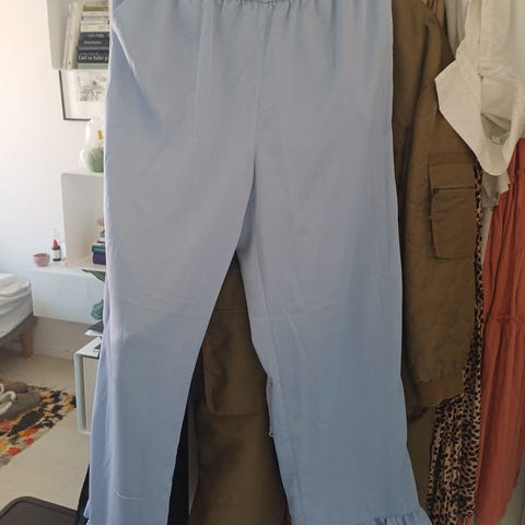 Har elastik og bindebånd i taljen. Skjulte lommer i siderne. Ankellængde og brede bukseben.