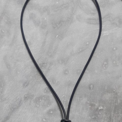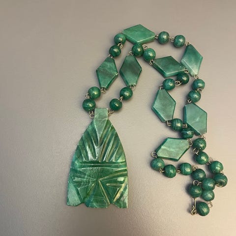 En fin halskæde i grøn jade med skruelåg. Den er 52 lang og 0,6 cm bred.
