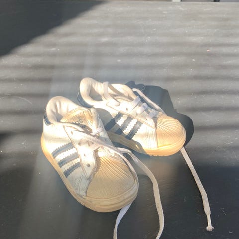 Adidas børnesko str. 25 til børn, unisex-model. Skoene er hvide med sorte striber og har velcrolukning med tre remme over foden. Overdelen er i syntetisk materiale med skalmønster ved snuden og polstret kant omkring anklen for komfort. Egnet som hverdagssko til både drenge og piger.