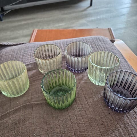Sælger dette absolut fantastiske sæt bestående af 3 gamle glasstager. De har en utrolig smuk farve og et lysspil, som skal ses i virkeligheden (se billederne!).