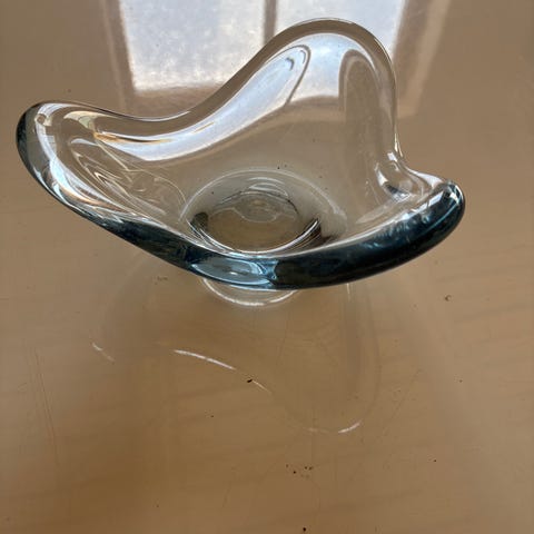 Sød lille tulipan vase, klar med blå kant. I flot stand. Måler ca. 7,5 cm i højden og 10 cm i diameter. Kan afhentes i Holstebro. Jeg sender også gerne på købers regning.