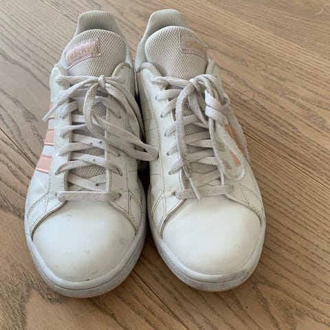 Adidas løbesko i størrelse 39. Skoene er blå med hvide detaljer og hvid mellemsål. Overdelen er i mesh-materiale for åndbarhed, og sålen er mønstret for greb. Egnet til løb og anden træning.