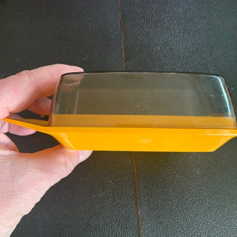 Beholderen kan rumme en standard pakke smør eller en lille ost og holde den frisk i køleskabet samt præsentabel på bordet.Retro fra midten af 1900 tallet.