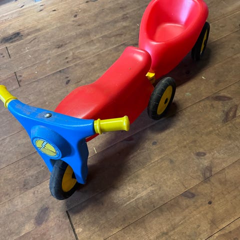 Rigtig god scooter med aftagelig anhænger og gummihjul som ikke larmer eller ridser gulvet. Er kun brugt indenfor. Rigtig Fin stand