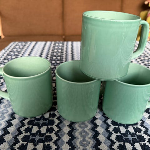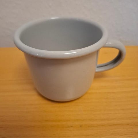 Sæt med stabelbare krus i forskellige farver, opbevaret i et metalstativ. Krusene har hank og kan stables lodret i stativet for pladsbesparende opbevaring. Velegnet til servering af varme eller kolde drikke i køkken eller på kontor. En kop mangler.