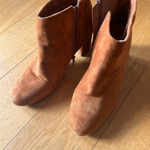 Apair ankelstøvler i str. 38. Ankelhøje støvler i brun ruskind med lav blokhæl. Lynlås i siden for nem af- og påtagning. Overdel i ruskind og inderside i glat læder Egnet som hverdagssko eller til mere pænt brug på alle årstider.