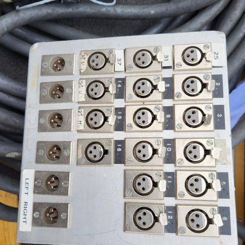 Multikabel (25m) med stageboks med 14+4 XLR stik i robust transportkasse. Stageboksen har 14 XLR hun-indgange og fire XLR han-udgange, mærket med bl.a. L, R og AUX. Kablet er samlet i én multikabel-slange med flere tilslutninger i den ene ende og stageboksen i den anden. Egnet til lydfordeling mellem scene og mixer, f.eks. til live-lyd, øvelokale eller faste installationer, hvor der er behov for at samle flere mikrofon- og linjesignaler i ét kabel.