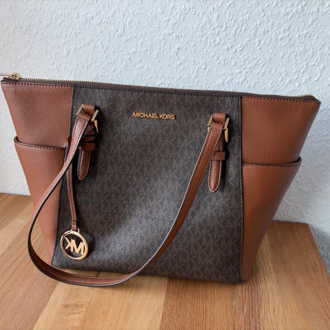 Tasken har MK-mønstret yderside med lysebrune detaljer, justerbare skulderremme og bærehank øverst. Lukning med lynlås og 2 indvendige foret rum med ekstra lynlåslomme og små lommer, samt 2 forlommer ligeledes forede.