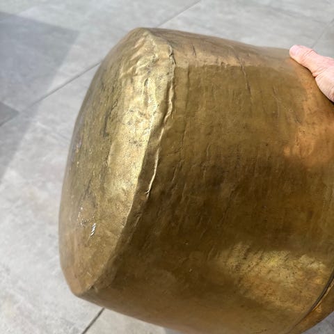 Smuk skål i håndsmedet messing. Den ligner lidt de tibetanske syngeskåle, men det tror jeg nu ikke det er. Lyden er lidt for sprukken. Den er rund i bunden, så måske skal den bruges omvendt som pynt ☺️