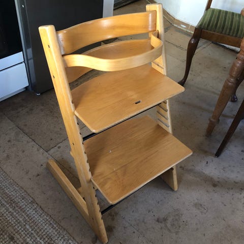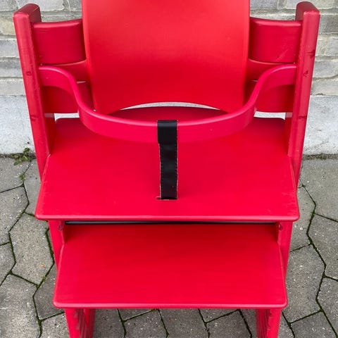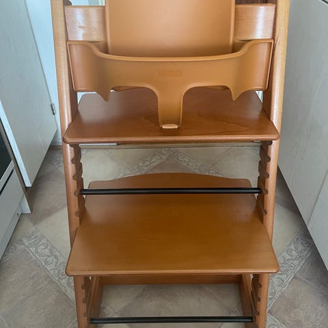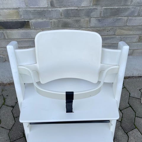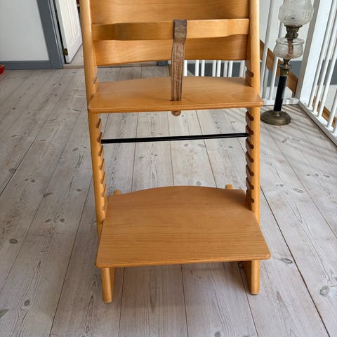 Stokke højstol i træ i naturfarve. Højstolen har justerbar siddeplade og fodplade, så den kan tilpasses barnets højde. Udstyret med bøjle og læderrem mellem benene for ekstra støtte til mindre børn. Egnet som spise- og siddeplads ved bordet for børn i forskellige aldre.