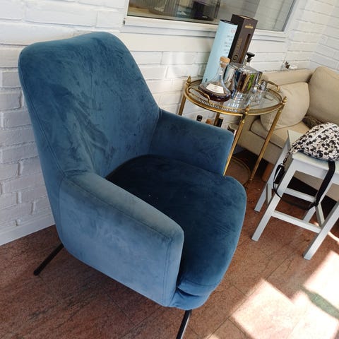 Sælger denne rigtig fine grønne velourlænestol, som er købt i JYSK. Den fremstår næsten som ny, udover et lille brugsspor på siden, som dog ikke er særlig tydeligt.