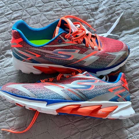 Skechers løbesko i størrelse 44.1/2 Modellen er en letvægts løbesko med snørelukning og QUICK-FIT udskæring i hælen. Skoene er primært røde med gule og orange detaljer samt hvid sål med røde gummipartier under bunden. Velegnet til løb og anden træning, hvor der ønskes en let og fleksibel sko.