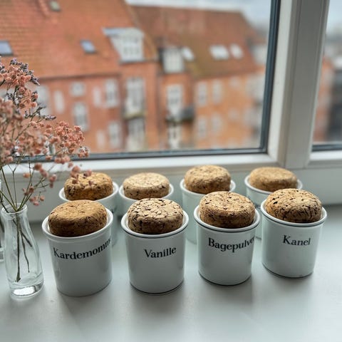 To små porcelænskrukker til opbevaring af krydderier, mærket med 'Esdragon' og 'Basilikum'. Krukkerne har en korkprop som låg og er pakket ind i plast. Produktet har en størrelse på 8,5x7,5 cm. Der er en logo eller navn på bunden af krukkerne.