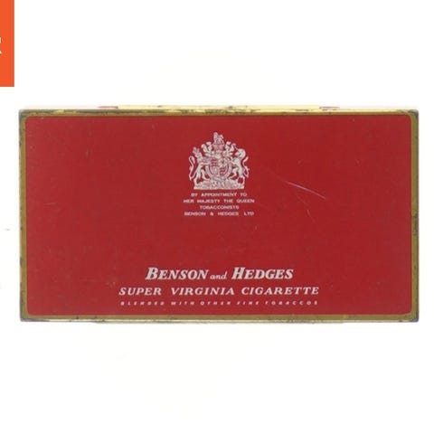 Dette er et cigaretetui fra Benson & Hedges, lavet af metal. Det har en rektangulær form med en størrelse på 14x7,5x2,5 cm. Etuiet er overvejende rødt med guldkanter og indeholder branding detaljer samt produktbeskrivelse. Indersiden har en poleret metaloverflade med yderligere branding tekst.