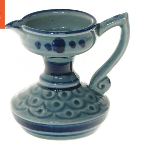 Denne vintage keramikkande har en detaljeret blåt og hvidt mønster og teksten 'Goslar' præget på siden. Kanden har en rund form med en lille hank og en hældetud. Den er lavet af keramik og har en diameter på 8 cm og en længde af 18 cm. Bunden af kanden har indgraveret tekst, der kan indikere modelnummer eller producent. Tags: kande, keramik, vintage, Goslar.