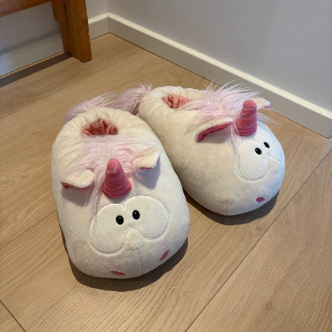 Et par farverige hjemmesko med enhjørning-design. Materialet er blødt og plysset, og de har et horn og ansigt detaljer foran. Størrelsen er 28-29, hvilket passer til et barn. Hjemmeskoene er i en blanding af blå og lilla farver.
