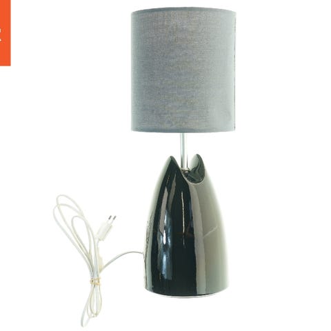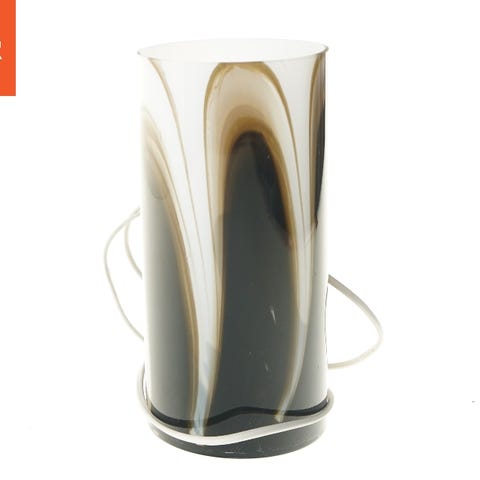 Denne bordlampe er lavet af glas i en cylinderform med en diameter på 12 cm og en længde på 25 cm. Den har en abstrakt sort og brun mønsterdesign med en hvid elektrisk ledning. Produktet er mærket 'IKEA 40W Made in France' i bunden af lampen.