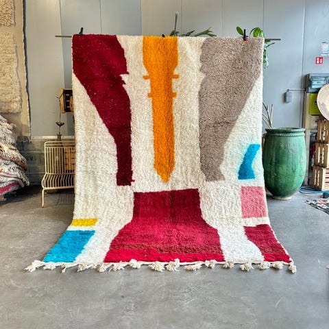 Autentisk farverigt Mrirt-tæppe vævet i hånden i Midtatlasområdet i Marokko, et område kendt for kvaliteten af sin uld og traditionelt berbersk håndværk. Dette tæppe er helt håndlavet af dygtige håndværkere ved hjælp af tidshævdede teknikker.