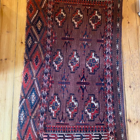 Oprindelse: Turkmenistan; Model: Turkmen Horse Cover; målene 100 × 98 cm; materiale Lana su lana; fremstilling i begyndelsen af det 20. århundrede og professionelt renset, i god stand med tegn på ældning og slid. Klik på den blå "gå til varen" knap, for at købe eller byde på denne vare. Den samlede pris vil blive vist inden du afgiver dit bud.