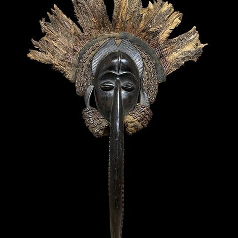 Pende solmaskine fra Congo, vævet af siv/kurvmateriale med fjerkrone, af fibre og tekstil, 70 × 70 cm (90 × 70 cm med headdress), fra 1950–1960, provenance belgisk privat samling, med certifikat for ægthed. Klik på den blå "gå til varen" knap, for at købe eller byde på denne vare. Den samlede pris vil blive vist inden du afgiver dit bud.