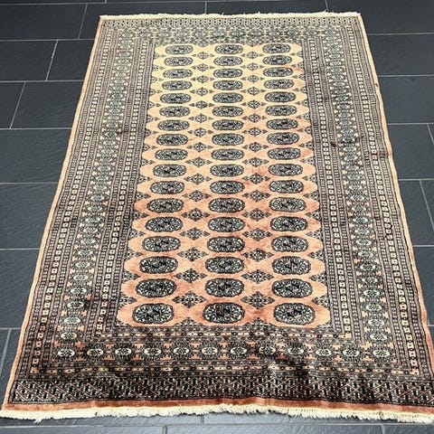 Vi præsenterer for dig et bemærkelsesværdigt, håndknyttet Buchara-orientteppe fra Pakistan – et sandt mesterværk inden for tæppekunsten.