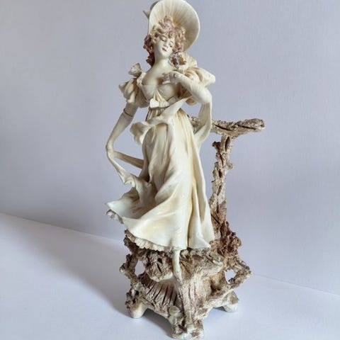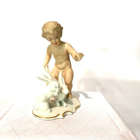 En biscuitporcelæns-figurin signeret CW med titel L'innocence de l'enfance, fremstillet i Tyskland af William Goebel omkring 1900, i fremragende stand, højde 15 cm, bredde 20 cm, dybde 7 cm, vægt 50 g, hvidt porcelæn. Klik på den blå "gå til varen" knap, for at købe eller byde på denne vare. Den samlede pris vil blive vist inden du afgiver dit bud.