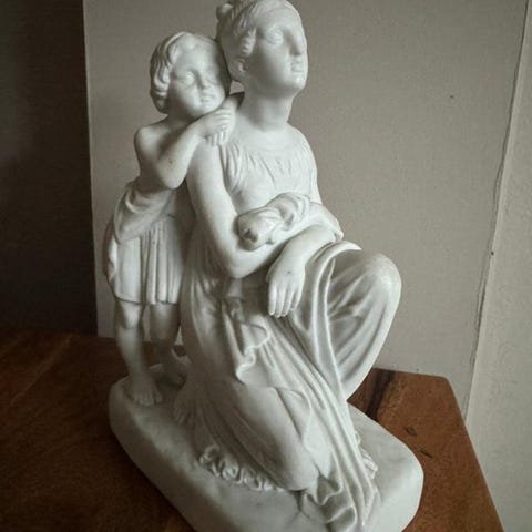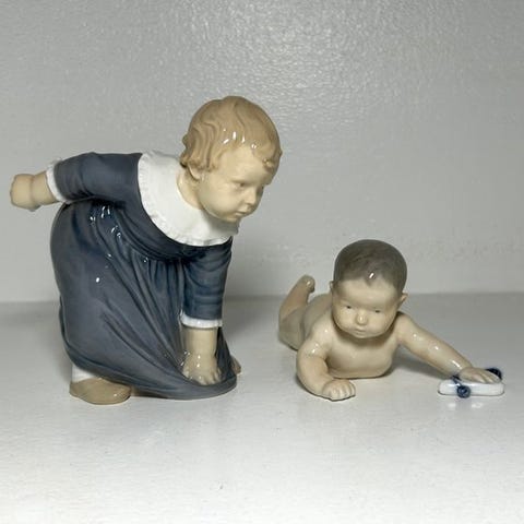 "Barnets uskyld: Fælles læsning" – Figur i porcelænsbiscuit, WG (William Goebel), omkring 1900.