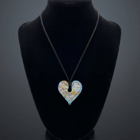 Vedhængets, i den raffinerede hjerteform, er håndlavet og prydet med 24 kt guldblad indsat i glasset, hvilket giver dybde, glød og en unik tredimensionel effekt.