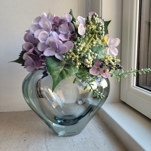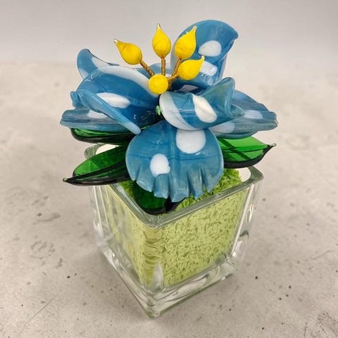 Pragtfuld komposition af blomster i Murano-glas, helt håndlavet med lampeglas-teknik; bladene er også lavet af glas, og både blade, blomsterblade og pistillerne kan placeres efter ønske. Basen i glas fyldt med små glassten af Murano-glas. Alle farverne smeltes ved 700 grader i glasset. Vedlagt er certifikat og hurtig, forsikret forsendelse.