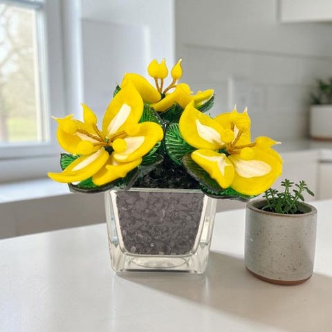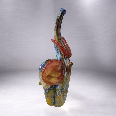 Fabelagtig sammensætning af blomster i Murano-glas, helt håndlavet med flammeglas-teknik; bladene er også lavet af glas, og både blade og blomsterblade samt støvdråberne kan placeres efter ønske.