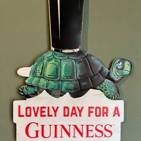 Stor oval plade, sort blank baggrund, gyldne bogstaver + underskrift af Arthur Guinness.