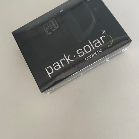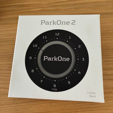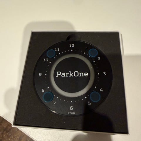 ParkOne parkeringsskive i rundt design. Enheden er sort med tydelig time- og minuttal omkring skiven. Egnet til montering i bilens forrude til visning af parkeringstid. Modellen har markeringer fra 1 til 12 samt minutinddeling og er beregnet som elektronisk parkeringsskive til brug i personbiler.
