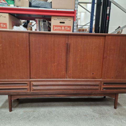 Skænk i teaktræ med skydelåger og indvendige hylder og skuffer. Der er skuffer i den venstre sektion. Og ellers er det bare hylder.