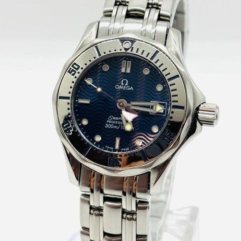 Dette er en 36 mm quartz mid-size Seamaster Professional 300M med blå bølgeskive.