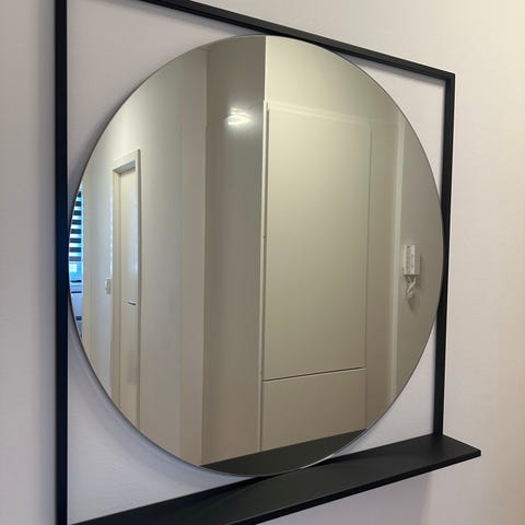 Audo Copenhagen rundt spejl med metalramme. Spejlet har en cirkulær form med en slank ramme i metal og front i klart spejlglas. Velegnet til ophæng i entré, stue eller soveværelse som vægspejl eller dekorativt element i indretningen.