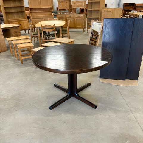 Egetræ rundt spisebord med tre tillægsplader…